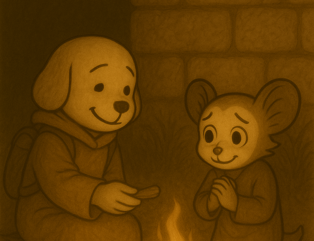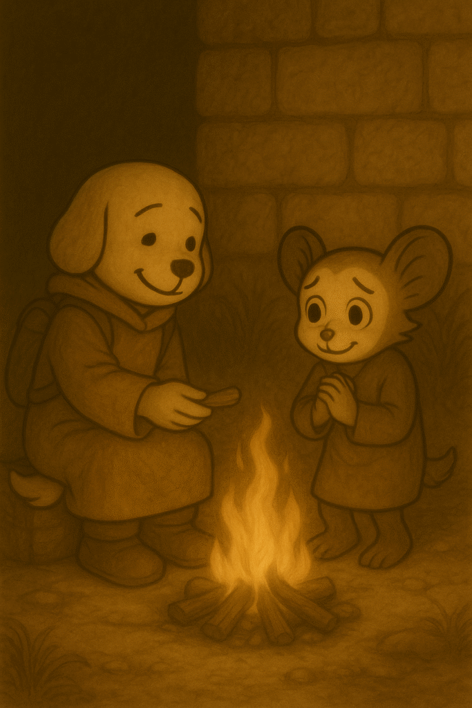 焚き火を囲むふたりの影が、石壁にやわらかく揺れていた。 上を見上げれば、王都の灯りがわずかに空を染め、星たちは遠慮がちに瞬いていた。