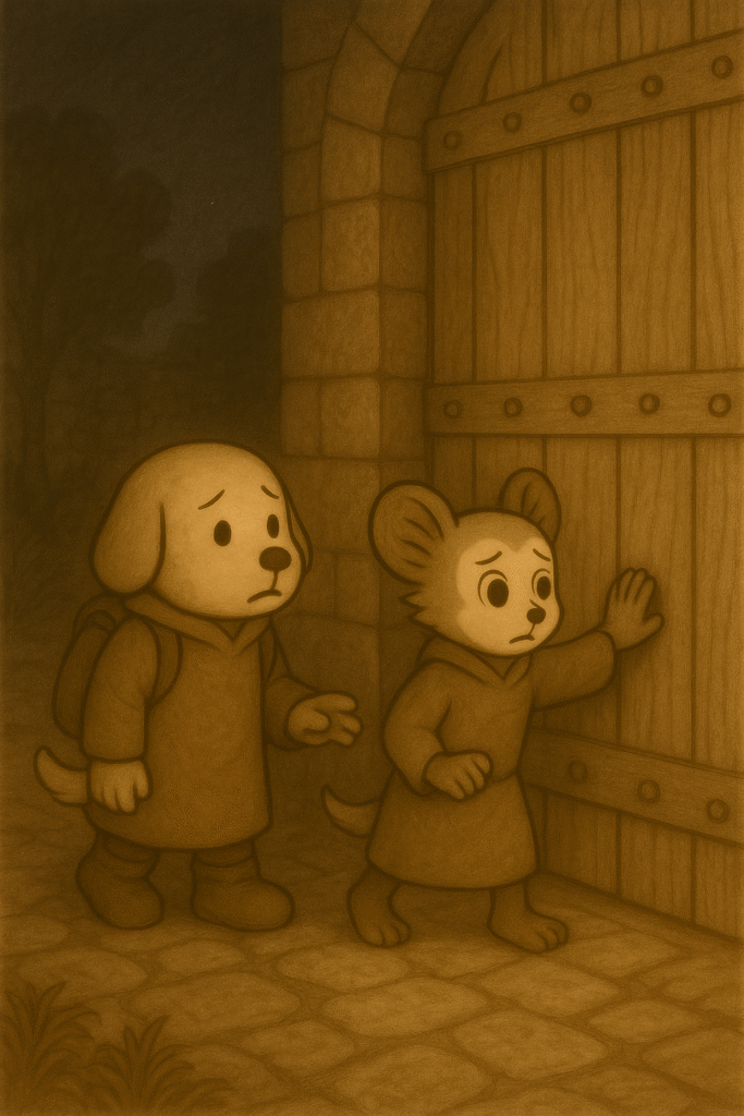 ふたりは立ち上がり、そっと門へ近づいた。 夜の門は昼間よりも大きく感じられた。重々しい沈黙の中、金属の匂いと、わずかな土の香りが混ざっていた。