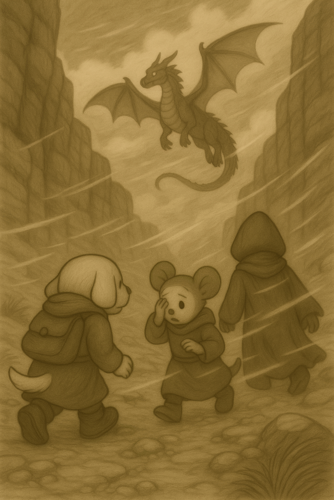 アイアイ、グリグリ、猫の使者は、身を低くしながら足場を確かめつつ進む。 頭上ではツヴェイが何度も旋回しているが、その姿もときおり風にかき消され、完全に見えなくなる瞬間があった。