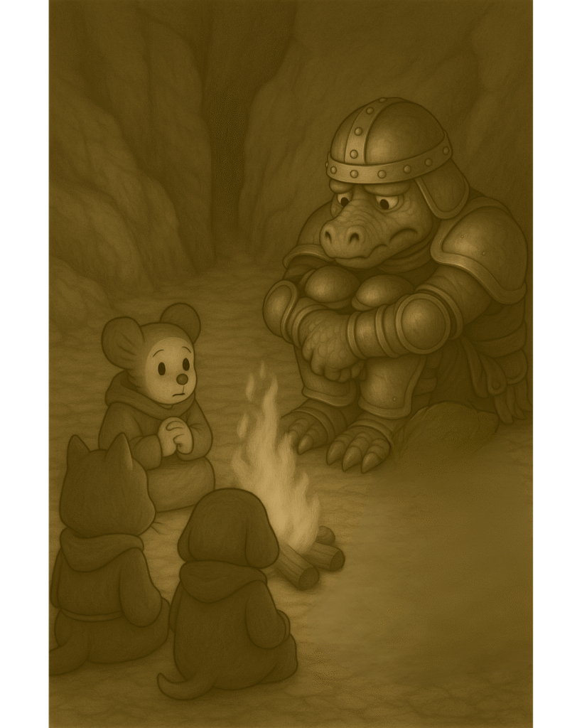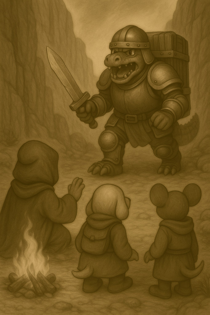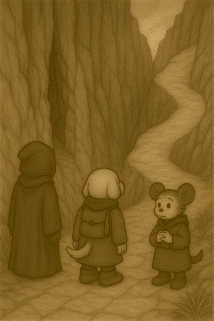 猫の使者が岩陰に小さな焚き火の準備を始めると、グリグリは持ち歩いていた水筒と食料袋を取り出し、どこか嬉しそうに並べはじめた。アイアイは少し離れた岩に腰を下ろし、カバンから手帳を取り出して、静かに今日の出来事を記録しようとしていた。