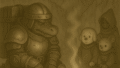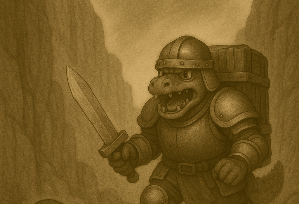 峡谷の岩壁を振動させるような足音とともに、ひときわ大きな影が現れる。重々しい甲冑に全身を覆われ、背には箱のような巨大な荷物──いや、鉄板を繋げて作られた移動式の荷車のようなものをしょっている。
