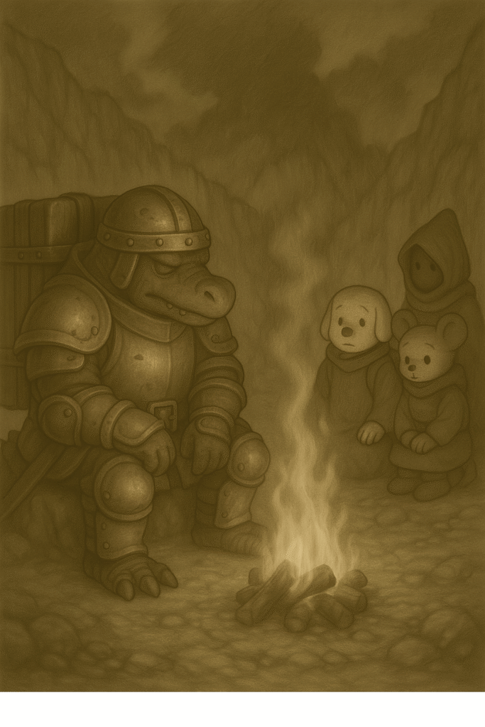 ダガールは荷車をそっと地面に下ろし、その脇に腰を下ろしていた。彼の背には長年の旅で磨耗した傷跡がいくつも刻まれており、それらが語らずとも彼の過去を物語っていた。
