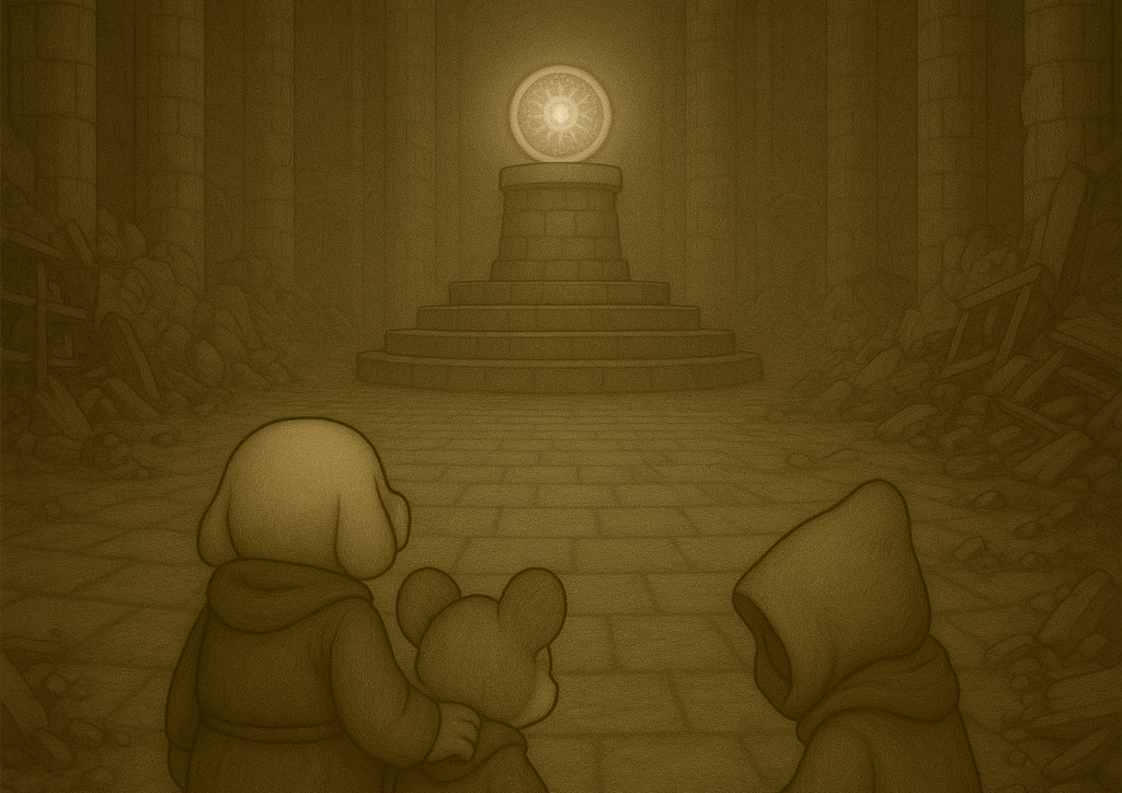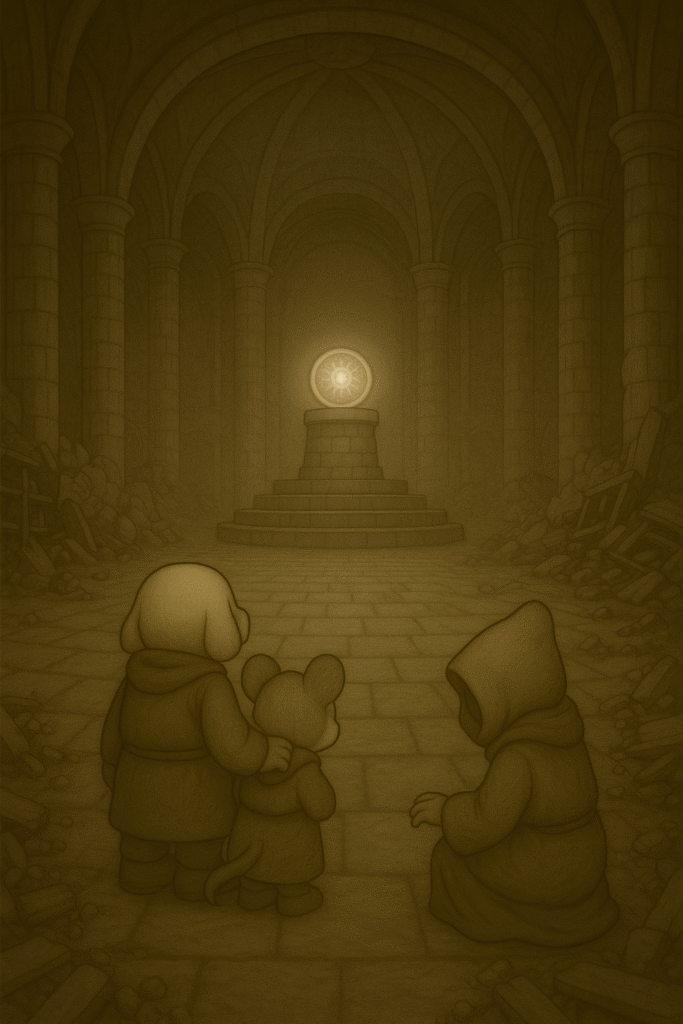 三人は歩を進めた。廊下の石畳はところどころ崩れ、天井から差し込む光が斑に揺れている。