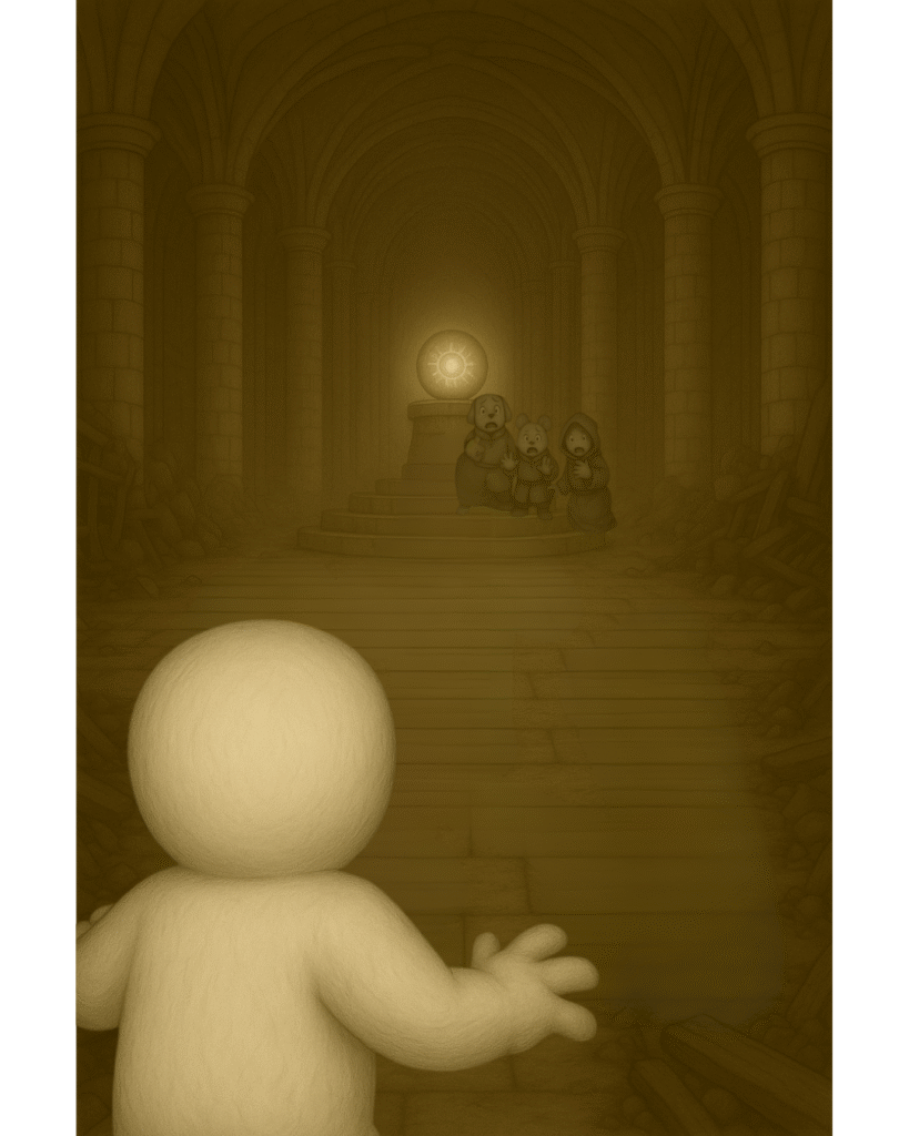 アイアイは気のせいだと自分に言い聞かせながら歩き続けた。葉を食いしばり、気づけば袖をにぎるグリグリの手をつよく握り返していた。不気味な廊下を通り、途中、崩れた箇所をなんとか避けながら探索を続けた。