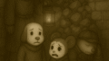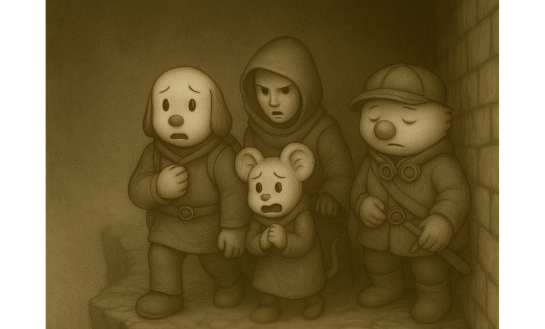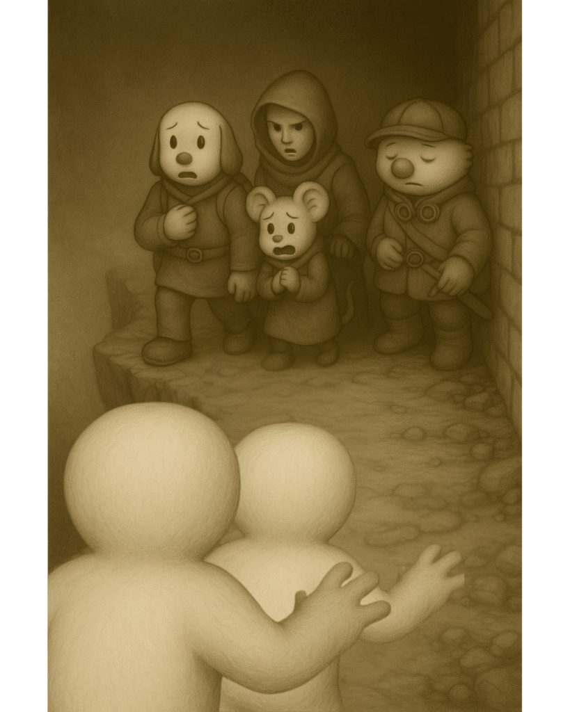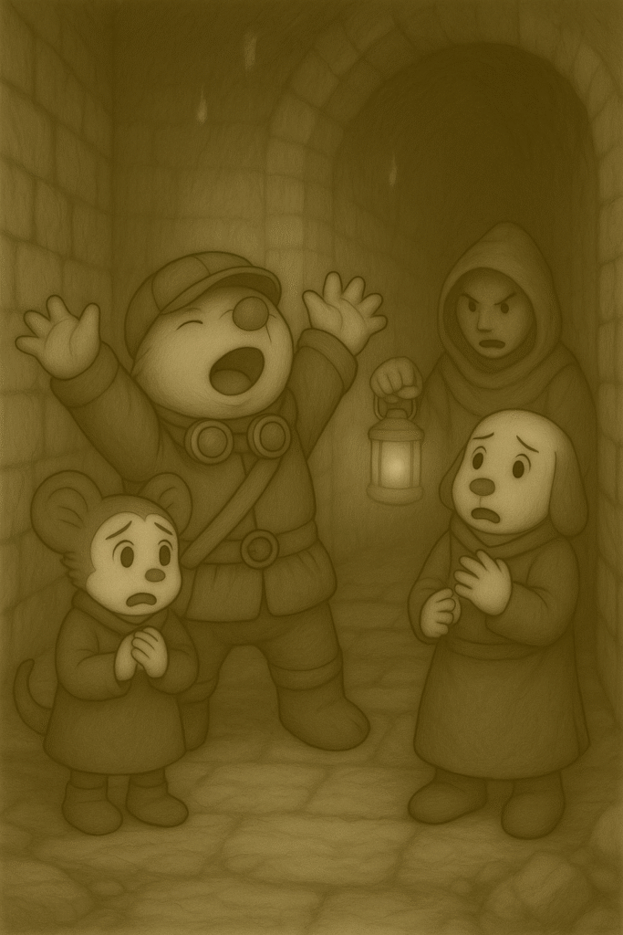 暗い横道に転がり込んだ後、猫の使者が扉代わりに崩れた石を押し込み、通路をふさぐ。