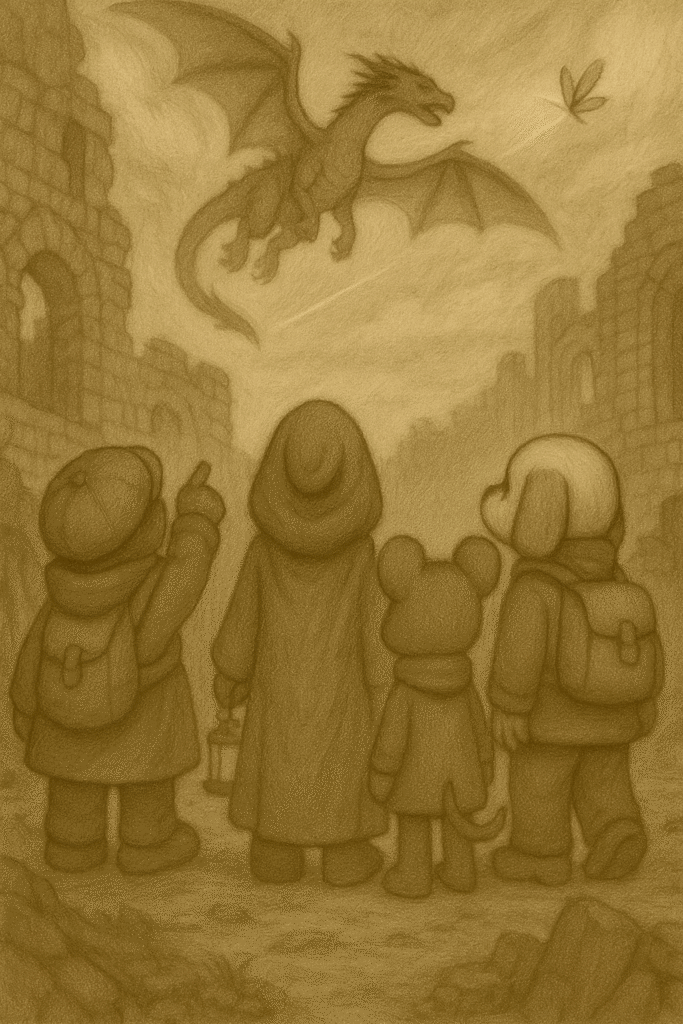 湿った地下の息苦しさから解放されたのも束の間、猫の使者の号令で四人は解放されていた地下への扉を閉ざし、近くの石を拾い集め、扉の上に敷き詰めた。
