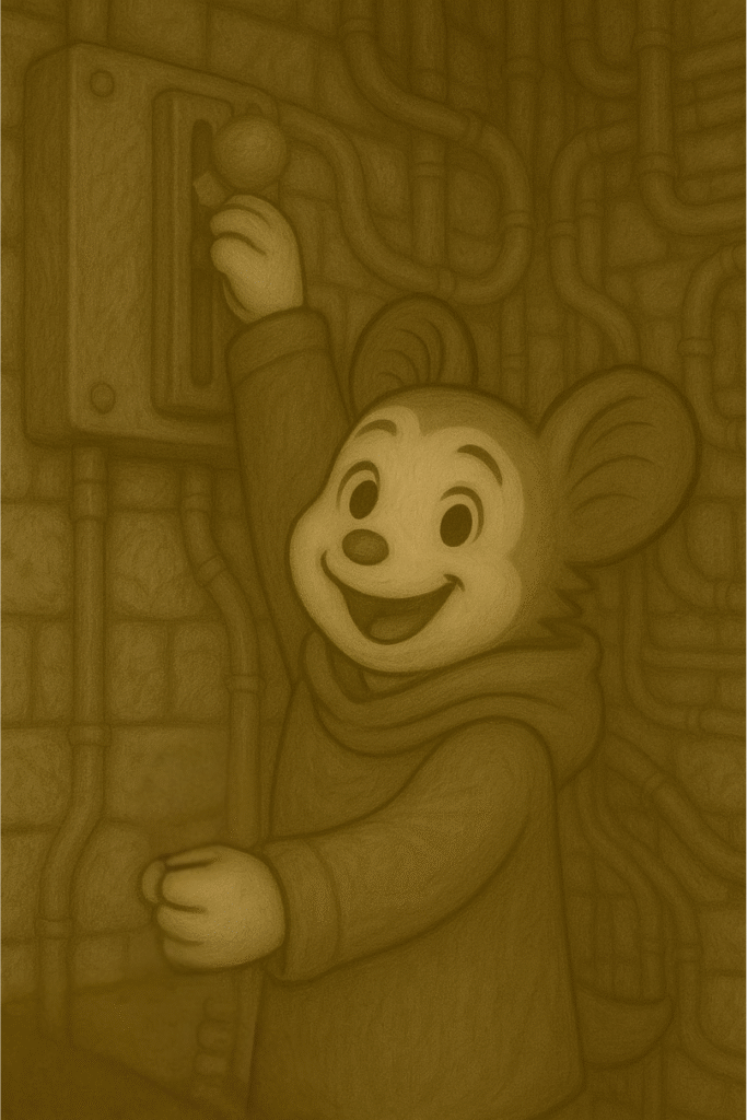 中庭の扉を押し開けた先は、湿った石の匂いとはまったく異なる空気が満ちていた。壁や床には金属の管や銅線のようなものが縦横に這い、まるで血管のように室内を埋め尽くしている。