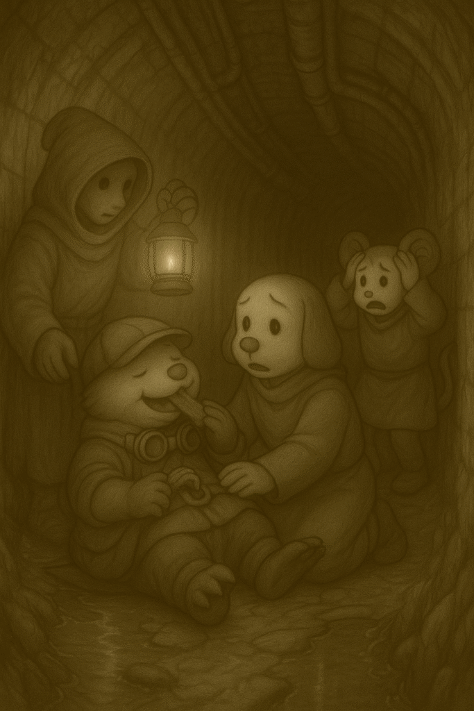 通路の幅は人ひとりがやっと通れるほどで、壁面には苔と湿った泥が張り付き、ところどころから地下水が滴り落ちていた。背をかがめなければ進めず、頭上を掠めるように錆びた管が這っている。息を吸うたび、鉄と土が混じった匂いが肺に染み込んだ。