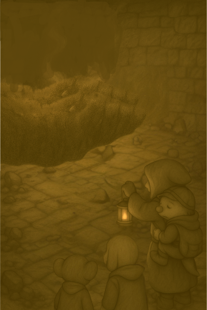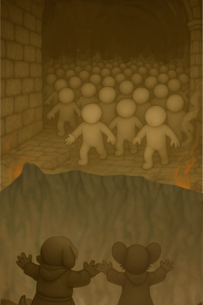 やがて、その群れが穴の縁に差しかかると――ウーセルたちは、アイアイたちにまっすぐ顔を向けながら、迷いなく虚空に足を踏み出し続け、そのすべてが暗黒の奈落へと落ちていった