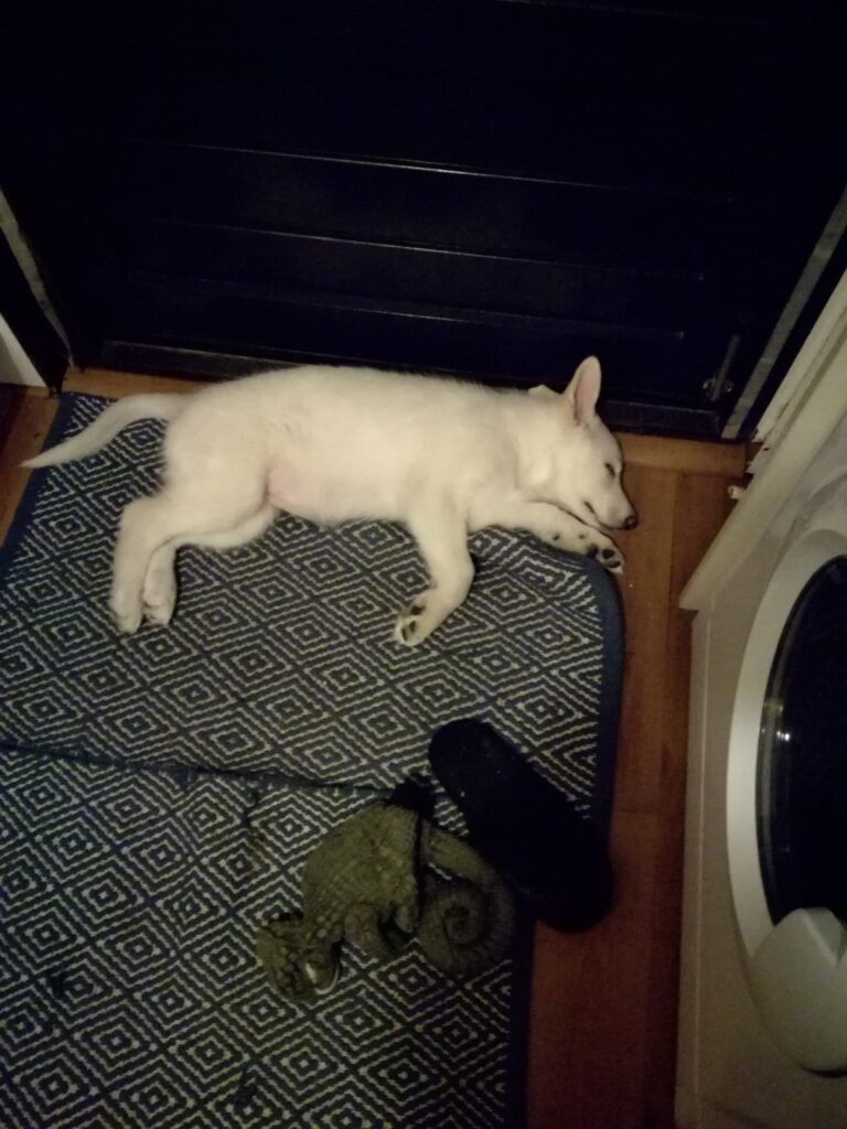 でかくなりすぎたので、出入口の扉は取り外して、はみ出ながら寝てます。