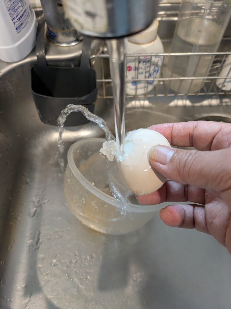 そうすることで、一気に薄い膜が卵本体から離れるのでその後、殻をむきやすくなります。