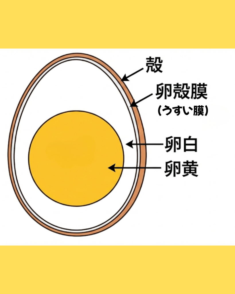 ゆで卵は、卵本体(可食部)・卵をつつむ薄い膜・殻の三層構造になっています。