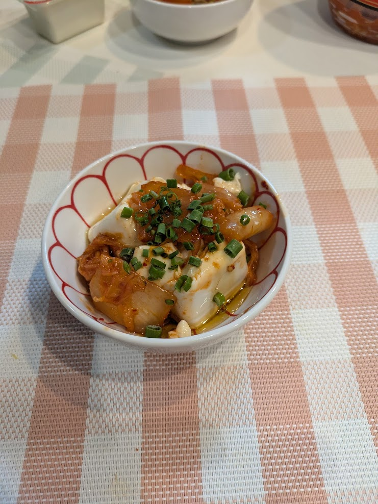 キムチをのせます。ごま油かけます。醤油たらします。小葱散らします。終了です。