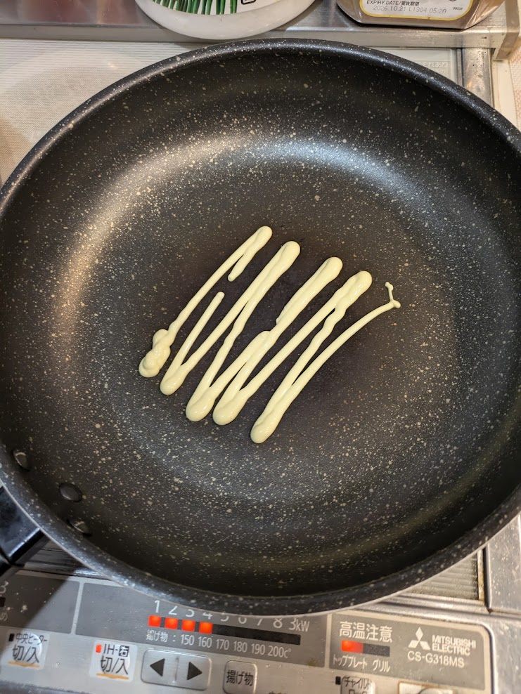 ②あたためたフライパンに、(油の代わりに)マヨネーズを投入します。