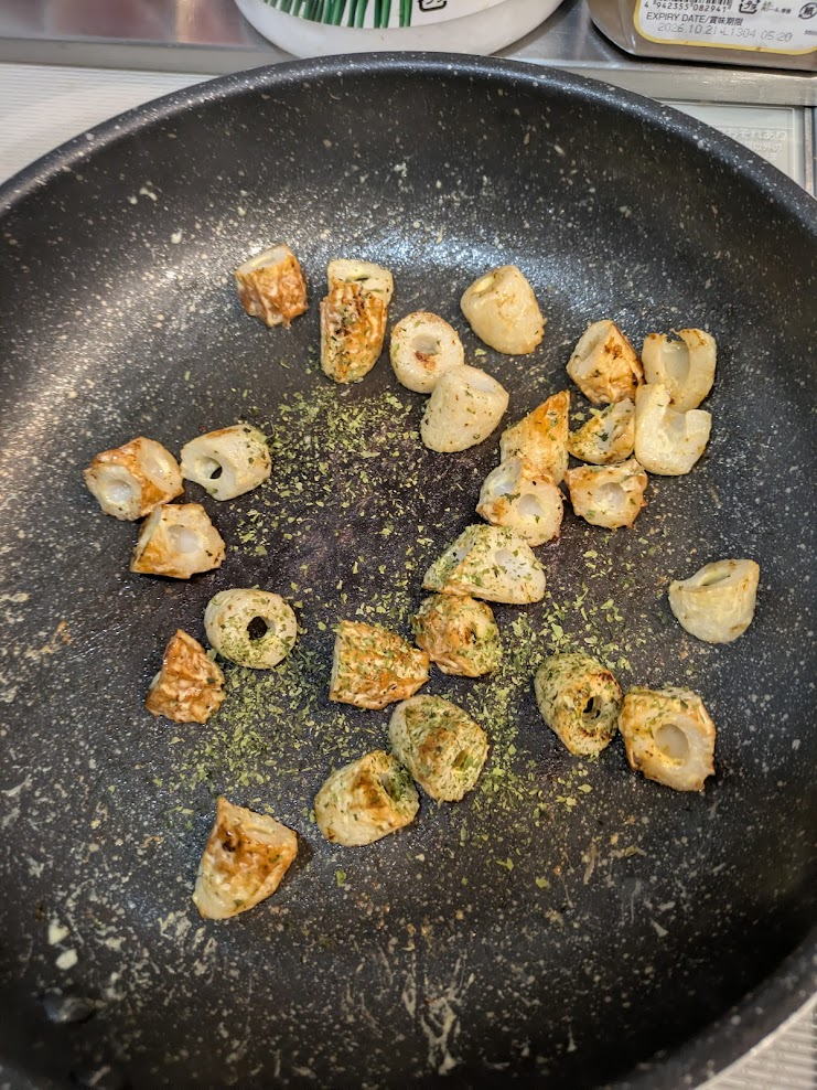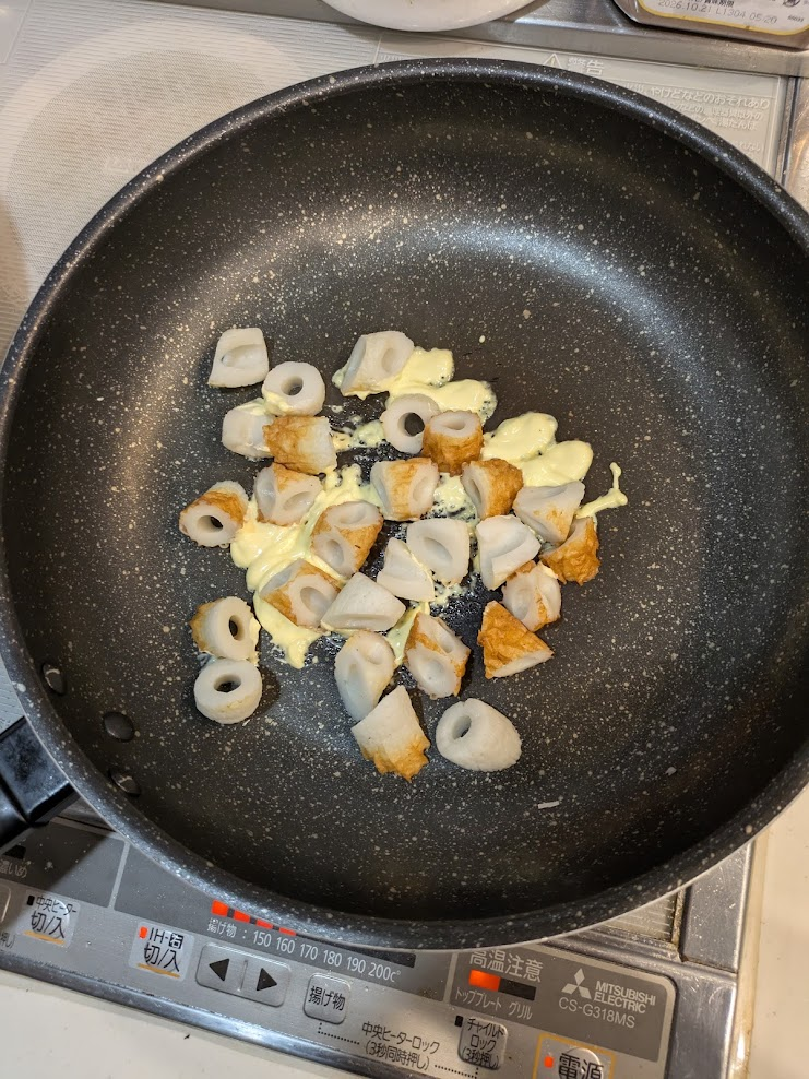 マヨネーズを少し温めたら、乱切りにしたちくわをと投入します。