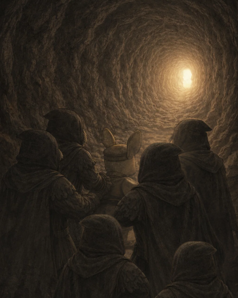 石壁は途切れ、天井も、床も、輪郭を失って、何かのために掘られた穴を進んでいく。